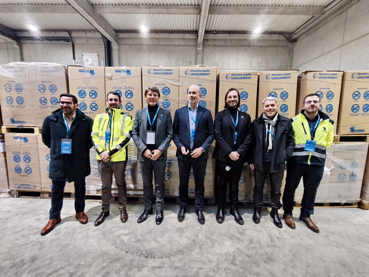 Voici de gauche à droite les dirigeants de Soprema qui ont participé à la décision de construire l’usine de ouate de cellulose à base de glassine à Beaune : Jean-Pierre Paradzinski, le directeur prescription de Soprema France ; Christophe Bourgouin, le directeur CSI ouate de cellulose ; Pierre-Etienne Bindschedler, PDG du groupe Soprema ; Jonathan Hartmann, le directeur général de Soporema France ; Charles Bindschedler, le directeur adjoint de Soprema France ; Olivier Weymann, le directeur Stratégie et Performance environnementale Soprema et Georges Yazidjian, le directeur de l'usine de Beaune. Ils se tiennent devant les cartons que Sopraloop, filiale de collecte et de recyclage des déchets issus des chantiers et des industries, met à disposition chez ses 990 fournisseurs de glassine à travers l’Europe, pour collecter cette matière première. Soprema reçoit 4 000 à 4 500 cartons de glassine par mois. © PP