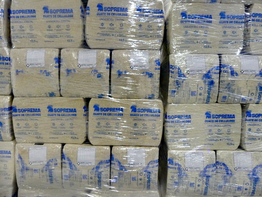 Soprema fabrique de la ouate de cellulose pour l’isolation thermique depuis 2009 à partir de papier recyclé. Mais voilà, quantités d’industrie utilisent le papier recyclé comme matière première. Sentant monter une pression concurrentielle sur sa ressource, Soprema a cherché avec quelle autre matière la ouate de cellulose pouvait être fabriquée. Après plusieurs années de recherche, d’expérimentations et des dépôts de brevets, Soprema s’est fixée sur la glassine : le support des étiquettes autocollantes.