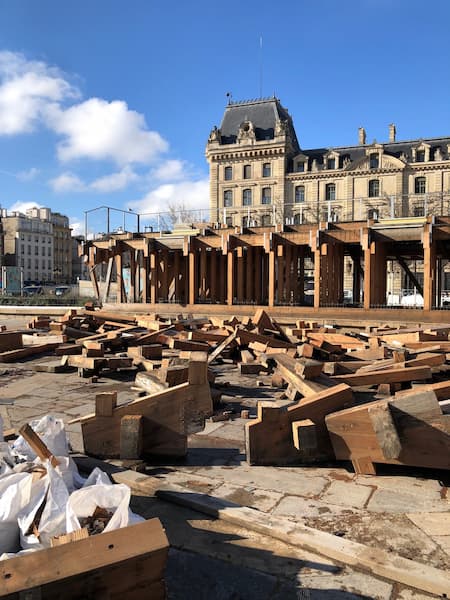 Démontage de l'estrade Weisrock sur le parvis de Notre-Dame. Comme pour l'Expo d'Osaka et ses précédentes, la conception pour ré-usage doit encore progresser, et les circuits de réemploi du bois ne sont pas au point. Pour autant, le réemploi est le grand thème du Forum 15. © Jonas Tophoven