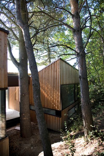Implantée sur pilotis, la Villa Embrun respecte la pente naturelle et préserve l’intégrité du sol, sans entraver ni les écoulements de l’eau ni le développement des systèmes racinaires. La végétation existante a été intégralement conservée ; elle joue un rôle déterminant dans la rétention des eaux pluviales et la stabilisation des terrains, transformant le paysage en allié plutôt qu’en contrainte. © David Huguenin