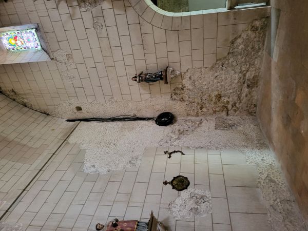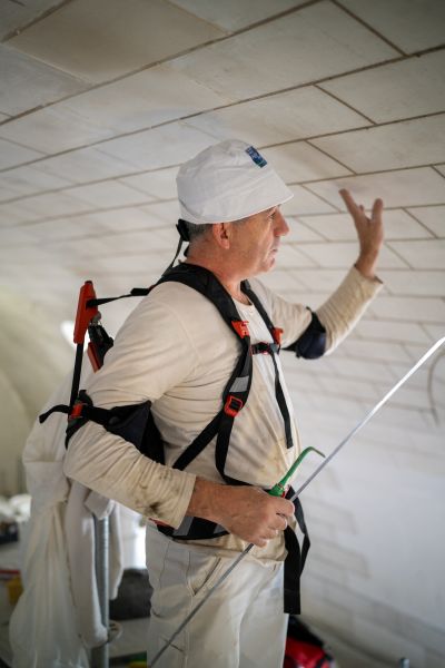 L’intervention, achevée en juillet, a mobilisé tout l’arsenal du plâtrier-staffeur-stucateur. Près de 800 m2 ont été repris en stuc : la totalité des murs de la nef et la moitié des voûtes ont été recréées, tout comme les encadrements en "pierre" de la porte principale, adaptée aux normes PMR. Sur ce chantier en hauteur, l’usage d’exosquelettes a sensiblement amélioré les conditions de travail, réduisant la pénibilité et permettant une application continue des enduits.