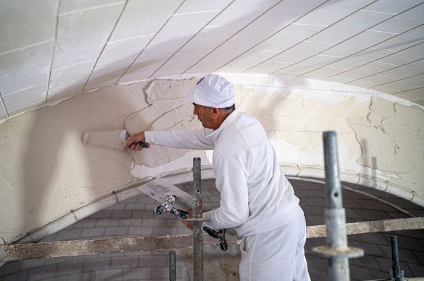À l’issue des relevés, l’entreprise Les Métiers du Plâtre a engagé la phase de préparation des supports : l’ancien enduit, ainsi qu’une couche de peinture au lait de chaux en sous-face, ont été soigneusement déposés afin d’assurer l’adhérence optimale du nouvel enduit à base de Molda® 3 Normal et de Lutèce® 2000 L (Placo®).