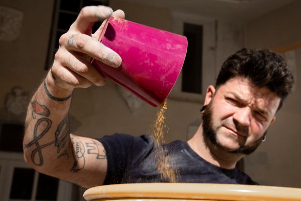 Pour obtenir ensuite la bonne texture, je mélange systématiquement les plâtres Lutèce® 2000 L et Molda® 3 Normal Placo®. Chacun a ses avantages. Le premier, souple et onctueux, a une prise longue permettant de réaliser l’enduisage de surfaces importantes. Le second se travaille facilement et offre une bonne reproduction des détails fins." explique Florent Pidoux, le dirigeant de l’entreprise Les Métiers du Plâtre, ici en photo. © Placo