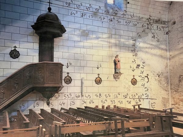 Le caractère unique du décor intérieur de l’Église Saint-Martin de Chanceaux-sur-Choisille tient au dessin rigoureux de ses pierres jointoyées, toutes aux dimensions singulières. Le chantier s’est ouvert par un relevé exhaustif de ces tracés : chaque pierre a été mesurée avec précision, l’ensemble des cotes reporté sur les murs et les voûtes, puis systématiquement photographié. Un travail préparatoire indispensable afin de garantir une restitution fidèle, pierre après pierre.