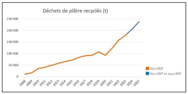 La dynamique s’est nettement accélérée à partir de 2021, avant même l’entrée en vigueur de la REP, portée par l’ouverture de nouvelles installations de traitement et par un maillage territorial renforcé. Au total, plus de 1,7 million de tonnes de déchets de plâtre ont été recyclées depuis 2008, illustrant la consolidation progressive et durable de la filière.