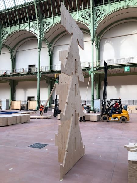 Le montage du Mur du Climat a l’air si simple ! Un camion, quatre panneaux CLT dressés et emboîtés, le système proposé par James Vitrac est tout aussi performant qu’impressionnant. Le vestiaire par l’ENSA Belleville part d’une structure Douglas assez banale, mais révèle progressivement sa grâce par le tartan de ses faces extérieures, une merveille. Sur le parvis, Carlos Barba a besoin de deux charpentiers sur deux nacelles pour sceller son ARBRI en bois de récupération à 6 m de haut. Il l’a dit, on l’a noté, mais… où les trouver ? Chez Le Bras Frères ? Chez Méha ? Chez Charpente Cénomane ? On en cherche finalement au Lens Pavillon qui ne se décide pas à monter malgré l’accaparement de deux grosses grues. En fait, un couple de charpentiers allemands devraient aider à accrocher les fleurs de Bloom Bloom sur les Bouquets de Douglas dès 14h, les voici maintenant sur le parvis d’entrée et le montage est laborieux.