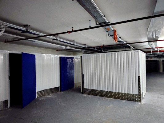 Dans les quinze compartiments protégés par des cloisons coupe-feu deux heures sont aménagés des boxes en cloisons et portes métalliques. Ils sont ouverts sur le dessus pour les sprinkleurs. 7 000 m2 de box de 1 à 25-30 m2 seront aménagés. Ils seront loués 30 à 35 € HT/mois, toutes charges comprises, dont les taxes et l’électricité. © PP