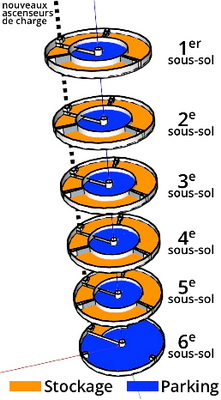 Lockall a créé trois compartiments à chaque niveau et conservé trois escaliers pour conserver les évacuations de sécurité. Ces compartiments sont séparés de la circulation au centre de la vis et les uns des autres par des cloisons coupe-feu deux heures. Le long de la circulation sont aménagées des places de parking qui serviront au chargement et déchargement des véhicules de moins de 2 m de hauteur. © Lockall / © PP