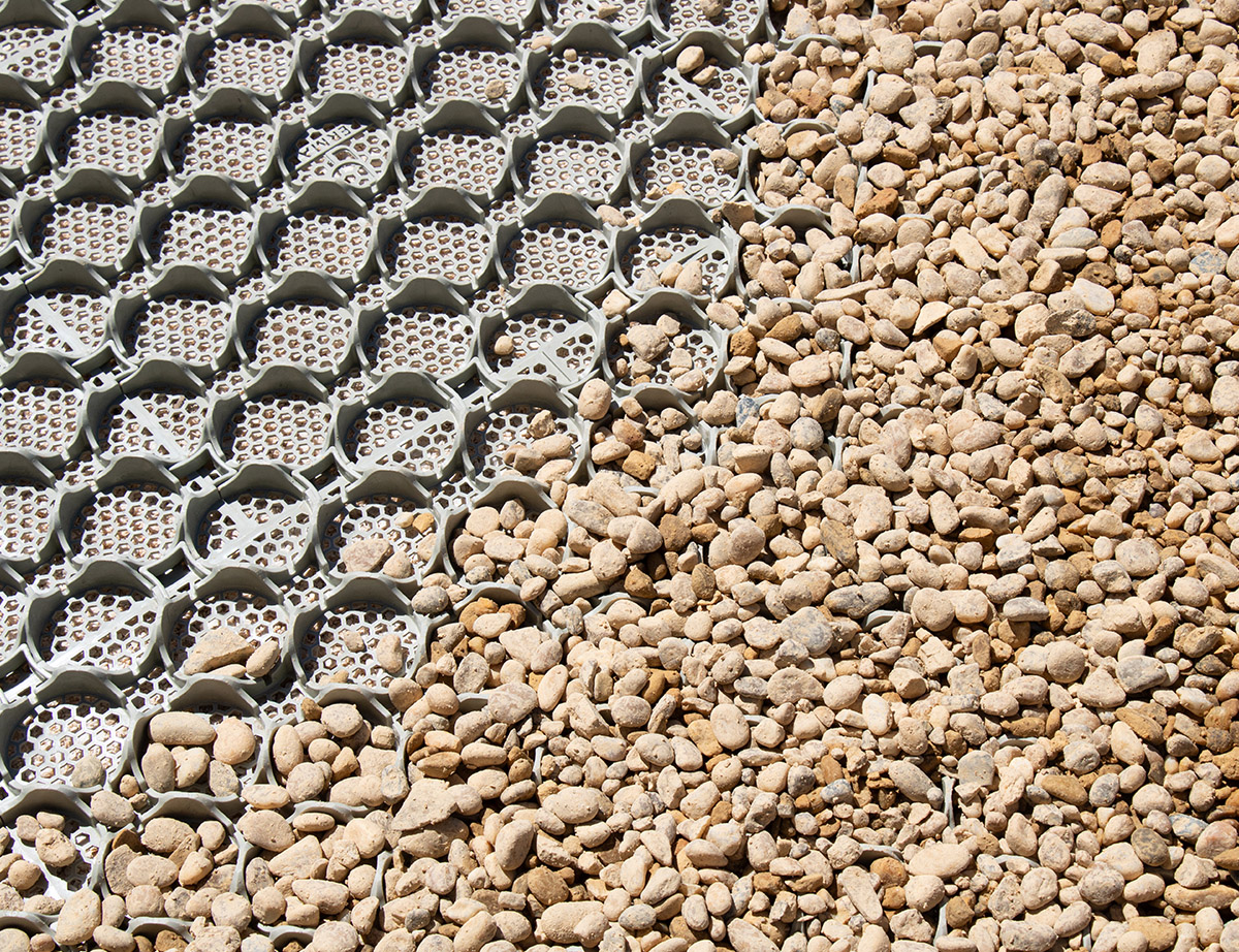 Sur un granulat libre, l'instabilité de surface compromet la circulation des fauteuils roulants et des poussettes. Le système PERMAB résout ce point par confinement mécanique du granulat : les alvéoles bloquent les déplacements latéraux et verticaux des pierres sous charge, produisant une surface de roulement ferme et plane.