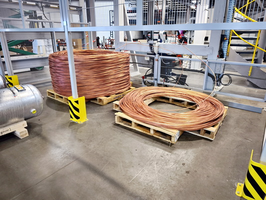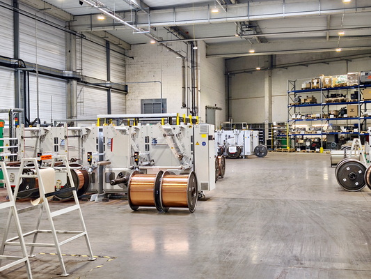 L’usine reçoit des tourets de câble de cuivre – elle n’utilise pas de câble en aluminium – de 8 mm de Ø. La première étape de fabrication est le tréfilage, c’est-à-dire la réduction du diamètre des fils de cuivre. Le tréfilage s’effectue de manière très précise en deux étapes. La première étape est l’ébauche et réduit le Ø à 6 mm. La seconde le descend à 0,15 mm. L’usine possède cinq tréfileuses qui seront toutes rassemblées dans le nouveau hall, de manière à permettre une optimisation de l’organisation de la production dans les halls existants. © PP