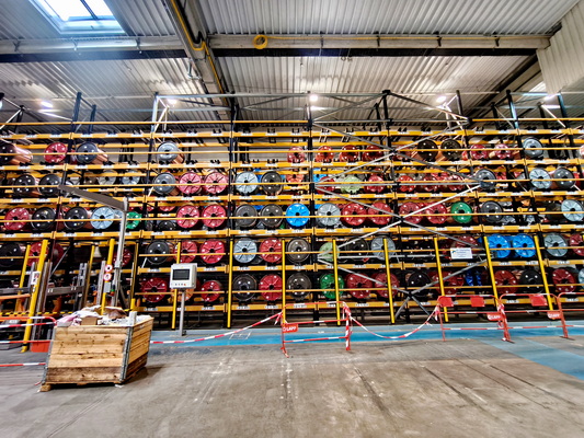 En sortie de tréfilerie et de toronnage, les câbles de cuivre sont enroulés sur des tourets, stockés dans un transtockeur à gestion très automatisée. C’est lui qui approvisionne les postes de transformation ultérieurs : protection et gainage. © PP