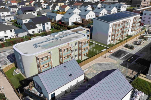 Avec 800 m2 habitables répartis sur trois niveaux (R+2), l’opération s’impose également comme le plus grand bâtiment de ce type en Europe. Livré en seulement 12 mois (TCE, hors infrastructure), le programme intervient dans un contexte de ralentissement de la construction neuve et de pénurie persistante de main-d’œuvre, notamment dans le gros œuvre.