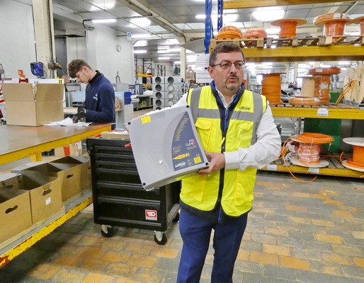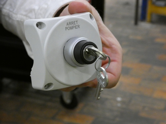 Saftair fabrique également ses propres coffrets de relayage, montés sur ses caissons de désenfumage. Lorsque quelque chose est monté sur un caisson de désenfumage, l’ensemble, ici caisson + coffret de relayage, doit être certifié en une seule fois. Lorsqu’un caisson ou une tourelle de désenfumage entre en fonctionnement, il n’est pas possible de l’arrêter. Ils sont équipés d’un boîtier d’arrêt, dont seuls les pompiers possèdent la clef pour stopper le désenfumage. © PP