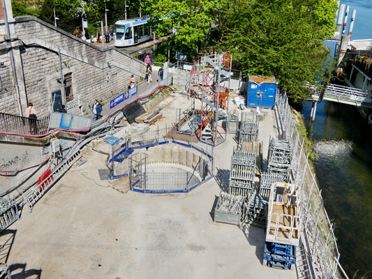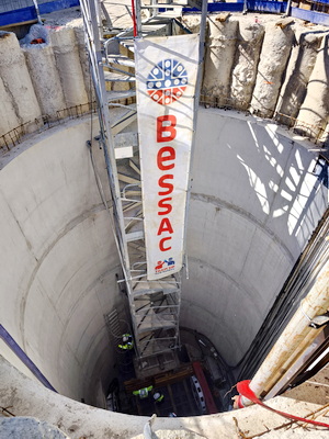 Pour descendre le mini-tunnelier, un puits de 20 m de profondeur a été creusé. Ses parois sont faites de fourreaux en béton qui, remplis de béton et protégés par une paroi en béton armé côté puits, constituent une gaine structurante descendant à 20 m. Le béton utilisé est bas carbone, fabriqué avec du ciment CEM III pour alléger l’empreinte carbone du chantier. © PP