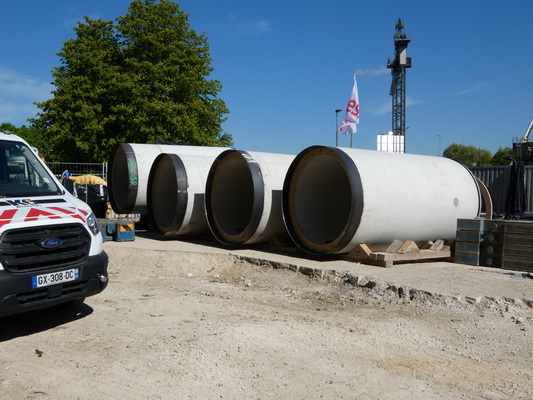 – Et, ce qui nous intéresse, intervention d’un micro-tunnelier sur 115 mètres pour poser deux conduites de transport d’eau potable en acier de diamètre 400 mm. Deux canalisations complémentaires en diamètre 800 mm de 35 mètres au total, réalisées en tranchée, feront la jonction avec les canalisations existantes. Enfin côté Seine, 6 mètres de conduite en diamètre 800 mm seront fixés le long de la structure du pont de Sèvres pour se raccorder à la conduite existante.