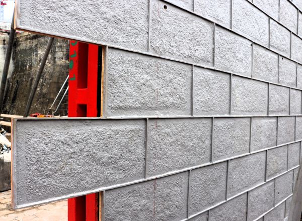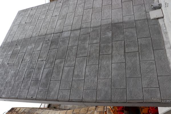 Les panneaux de matrices sont découpés en parties mâle et femelle qui s’emboitent, de façon à rendre les raccords de matrices invisibles car fondus dans les faux joints de pierre. Les banches toute hauteur (2 x 10 m) sont matricées en atelier, qui arrivent par camion sur le chantier, où elles sont levées pour application sur le voile béton.