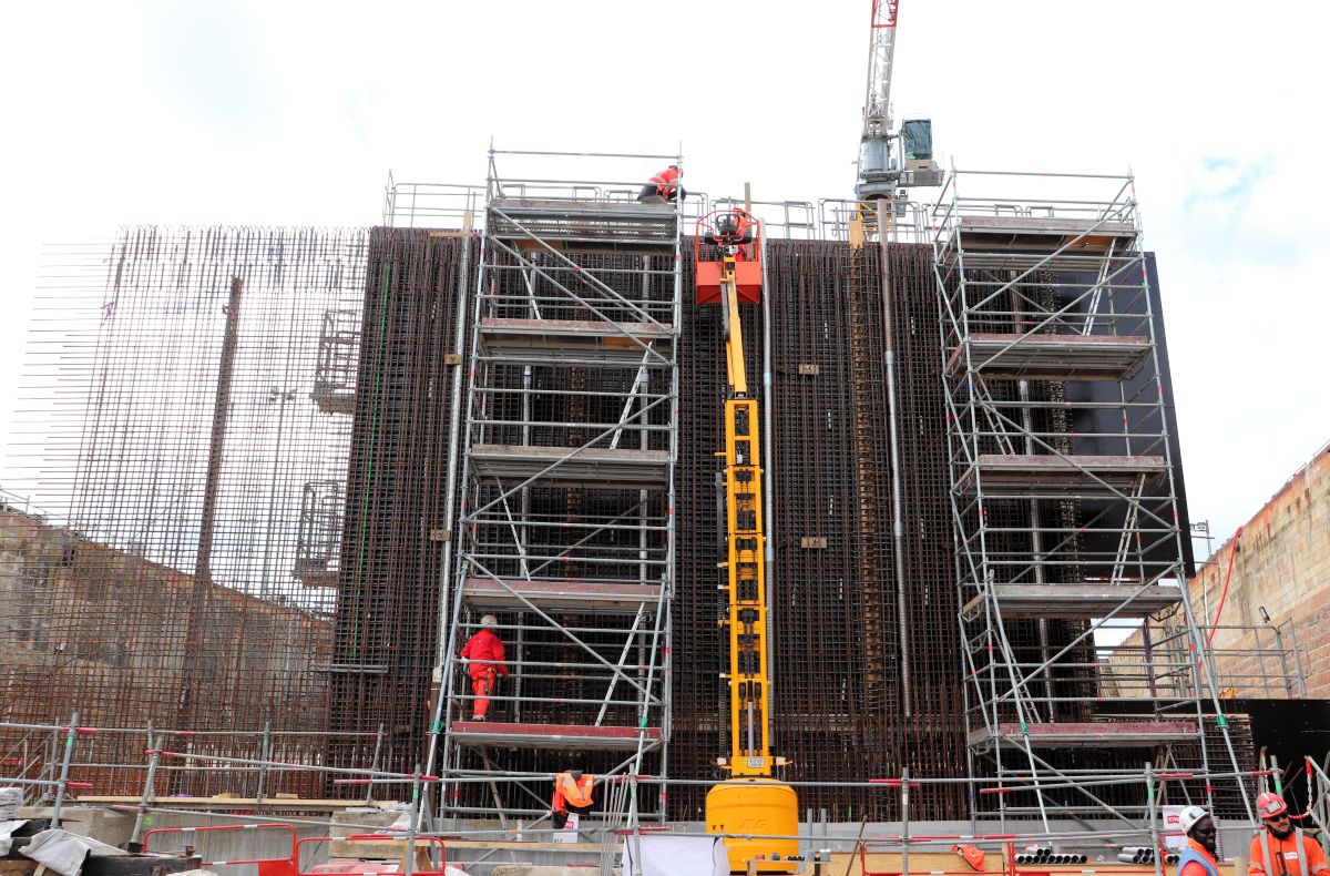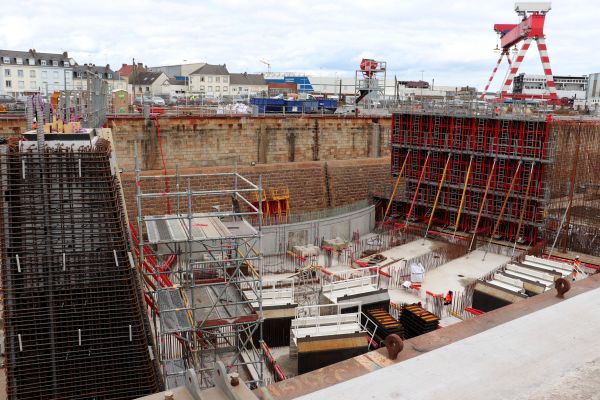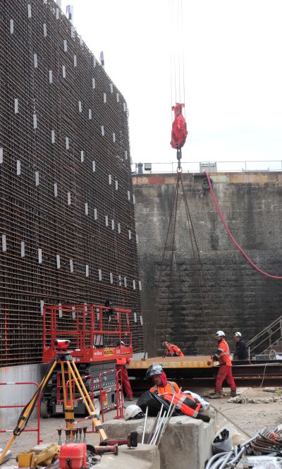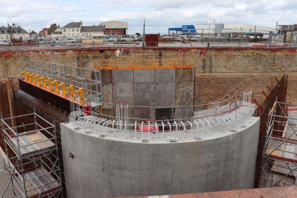 Les jetées Est et Ouest de l’éperon et son "nez" sont en cours d’élévation. La densité de ferraillage varie selon l’exposition des zones. © EJH