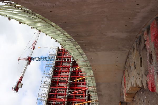 Un béton autoplaçant a été retenu pour être injecté par le bas dans les caissons (éléments de coffrage blancs) qu’on voit ici stockés en attendant leur mise en place sur les armatures. © EJH