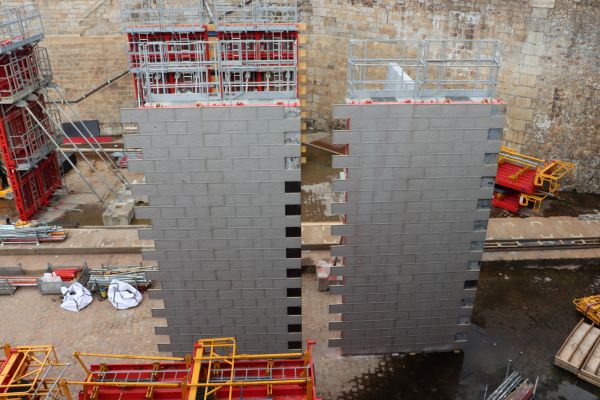 Coffrages de voiles de l’éperon : les banches matricées de 10 m de haut sont assemblées par deux :la jonction des panneaux sera invisible. © EJH