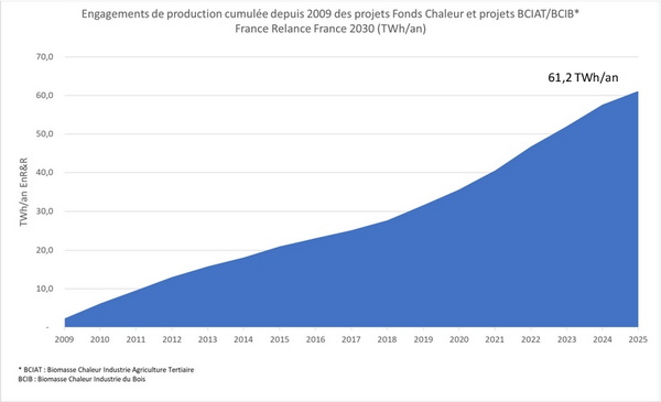 Depuis 17 ans, le Fonds chaleur a permis d’aider environ 11 200 installations d’énergies renouvelables et de récupération (EnR&R), dont 5 200 km de réseaux de distribution grâce à 5,9 milliards d’euros d’aides, ayant généré près de 18 milliards d’euros d’investissements. Cela représente près de 52,5 TWh/an de production additionnelle d’EnR&R, équivalent de la consommation de chaleur d’environ 5 millions de logements, et environ 2,6 Md€/an d’économie sur la balance commerciale, en comparaison du gaz qu’il aurait fallu importer pour produire cette chaleur en l’absence de ces projets.